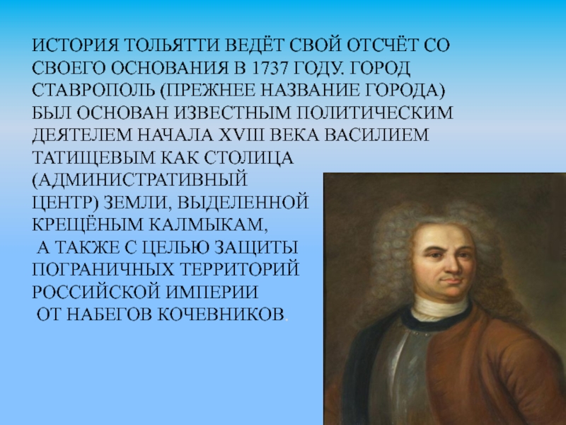 (прежнее название города) был основан известным политическим деятелем начала XVIII века Василием Татищевым как столица (административный