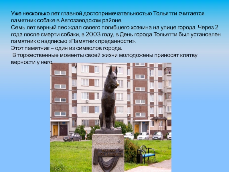 Слайд 19Уже несколько лет главной достопримечательностью Тольятти считается памятник собаке в Автозаводском