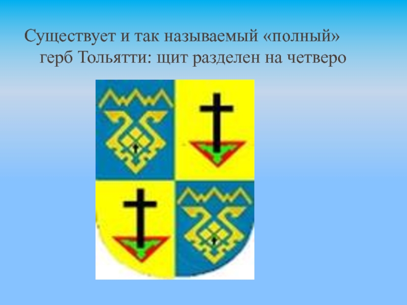 Слайд 10Существует и так называемый «полный» герб Тольятти: щит разделен на четверо