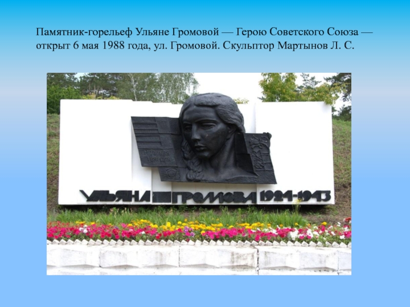 Слайд 18Памятник-горельеф Ульяне Громовой — Герою Советского Союза — открыт 6 мая