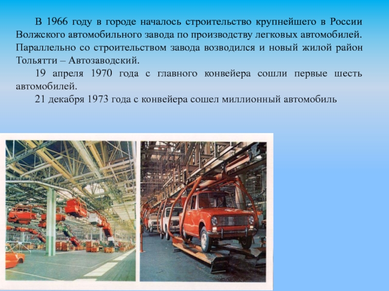 автомобильного завода по производству легковых автомобилей. Параллельно со строительством завода возводился и новый жилой район Тольятти – Автозаводский.