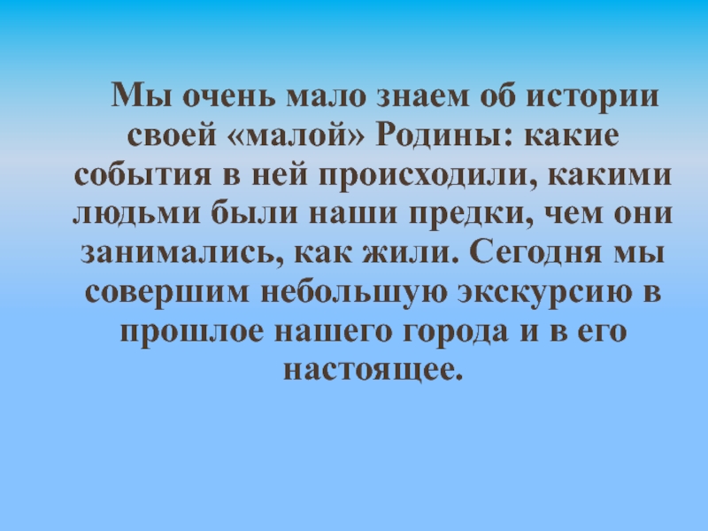 «малой» Родины: какие события в ней происходили, какими людьми были наши предки, чем они занимались, как жили. Сегодня мы совершим небольшую экскурсию в прошлое нашего города и в его настоящее.