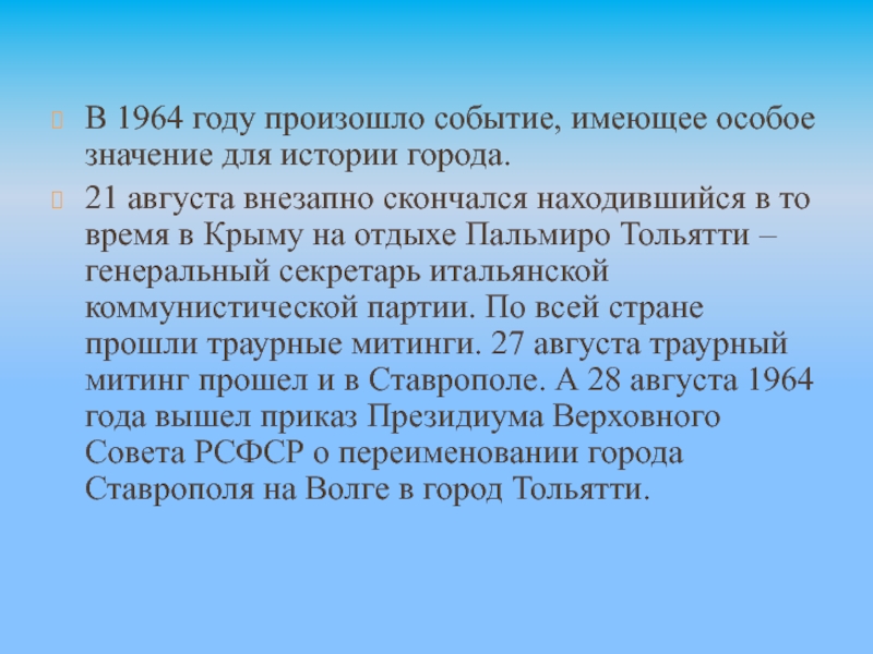21 августа внезапно скончался находившийся в то время в Крыму на отдыхе Пальмиро Тольятти – генеральный секретарь итальянской коммунистической партии. По всей стране прошли траурные митинги. 27 августа траурный митинг прошел и в Ставрополе. А 28 августа 1964 года вышел приказ Президиума Верховного Совета РСФСР о переименовании города Ставрополя на Волге в город Тольятти.
