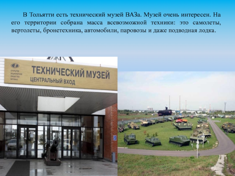 Слайд 15В Тольятти есть технический музей ВАЗа. Музей очень интересен. На его