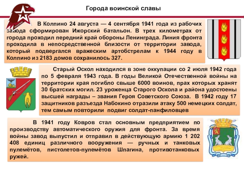 Старый Оскол находился в зоне оккупации со 2 июля 1942 года по 5 февраля 1943 года. В годы Великой Отечественной войны на территории края погибло свыше 6000 воинов, прах которых хранят 30 братских могил. 23 уроженца Старого Оскола и района удостоены высшей награды – звания Героя Советского Союза. В 1942 году 17 защитников разъезда Набокино отразили атаку 500 немецких солдат, тем самым повторили подвиг солдат-панфиловцев
