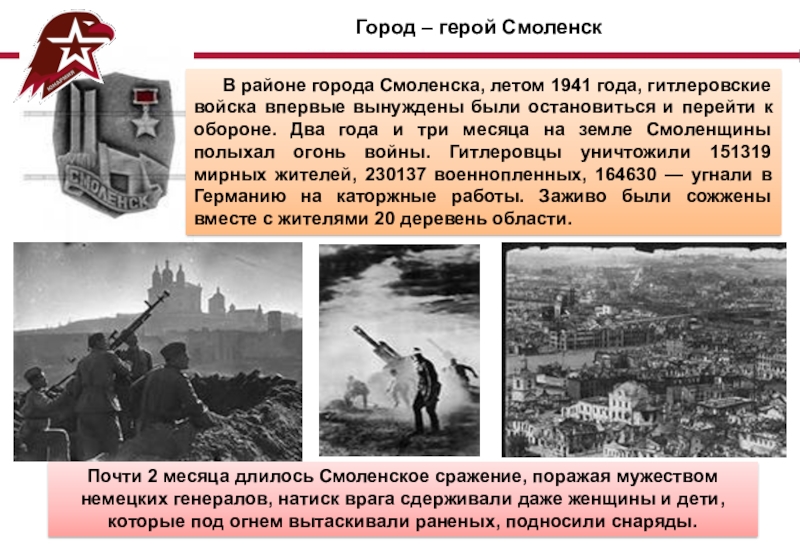 Почти 2 месяца длилось Смоленское сражение, поражая мужеством немецких генералов, натиск врага сдерживали даже женщины и дети, которые под огнем вытаскивали раненых, подносили снаряды.
