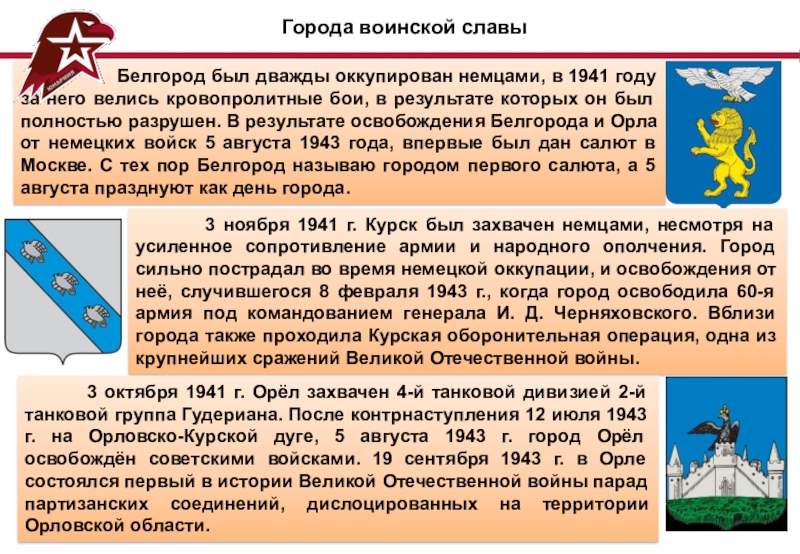 Белгород был дважды оккупирован немцами, в 1941 году за него велись кровопролитные бои, в результате которых он был полностью разрушен. В результате освобождения Белгорода и Орла от немецких войск 5 августа 1943 года, впервые был дан салют в Москве. С тех пор Белгород называю городом первого салюта, а 5 августа празднуют как день города.
