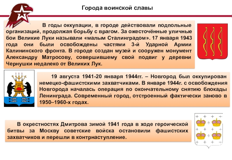 19 августа 1941-20 января 1944гг. – Новгород был оккупирован немецко-фашистскими захватчиками. В январе 1944г. с освобождения Новгорода началась операция по окончательному снятию блокады Ленинграда. Современный город, отстроенный фактически заново в 1950–1960-х годах.