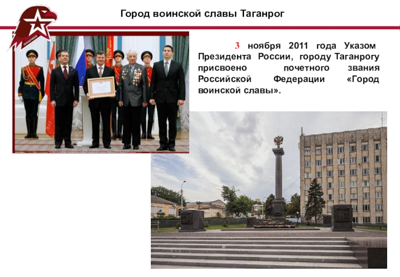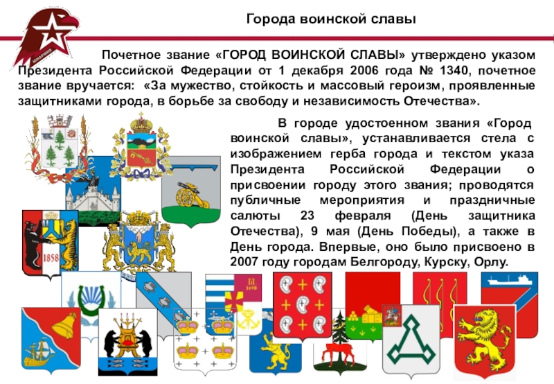 В городе удостоенном звания «Город воинской славы», устанавливается стела с изображением герба города и текстом указа Президента Российской Федерации о присвоении городу этого звания; проводятся публичные мероприятия и праздничные салюты 23 февраля (День защитника Отечества), 9 мая (День Победы), а также в День города. Впервые, оно было присвоено в 2007 году городам Белгороду, Курску, Орлу.