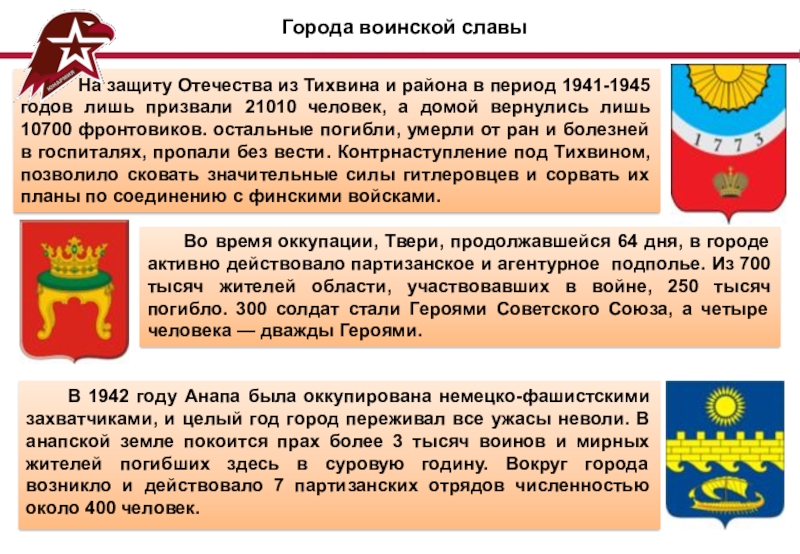 Во время оккупации, Твери, продолжавшейся 64 дня, в городе активно действовало партизанское и агентурное подполье. Из 700 тысяч жителей области, участвовавших в войне, 250 тысяч погибло. 300 солдат стали Героями Советского Союза, а четыре человека — дважды Героями.