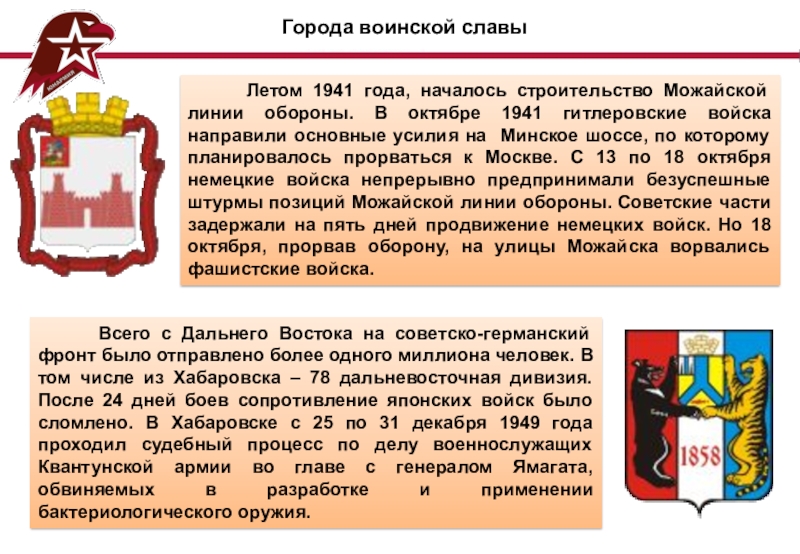 Всего с Дальнего Востока на советско-германский фронт было отправлено более одного миллиона человек. В том числе из Хабаровска – 78 дальневосточная дивизия. После 24 дней боев сопротивление японских войск было сломлено. В Хабаровске с 25 по 31 декабря 1949 года проходил судебный процесс по делу военнослужащих Квантунской армии во главе с генералом Ямагата, обвиняемых в разработке и применении бактериологического оружия.