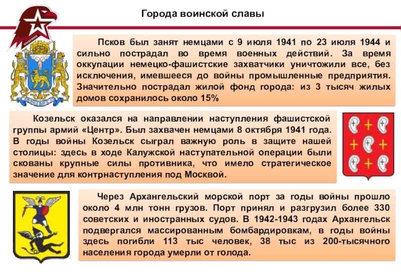 Козельск оказался на направлении наступления фашистской группы армий «Центр». Был захвачен немцами 8 октября 1941 года. В годы войны Козельск сыграл важную роль в защите нашей столицы: здесь в ходе Калужской наступательной операции были скованы крупные силы противника, что имело стратегическое значение для контрнаступления под Москвой.