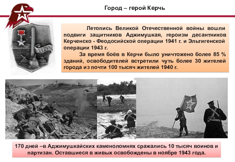 170 дней –в Аджимушкайских каменоломнях сражались 10 тысяч воинов и партизан. Оставшиеся в живых освобождены в ноябре 1943 года.