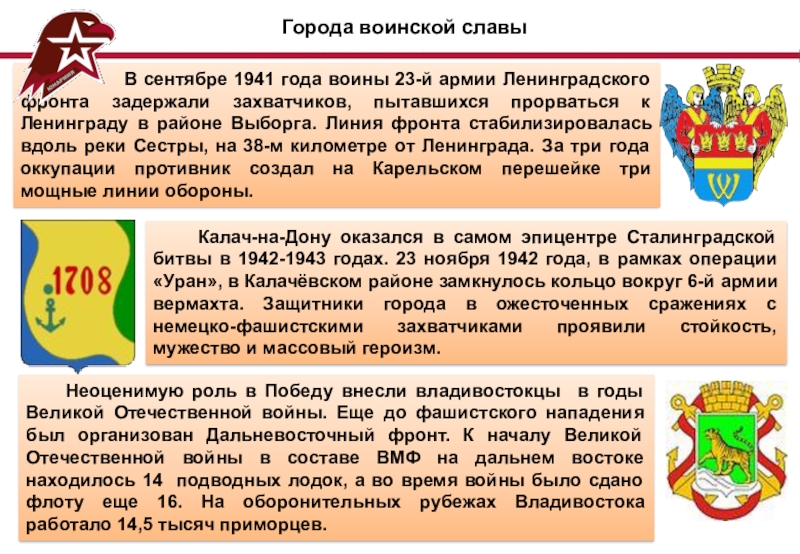 Неоценимую роль в Победу внесли владивостокцы в годы Великой Отечественной войны. Еще до фашистского нападения был организован Дальневосточный фронт. К началу Великой Отечественной войны в составе ВМФ на дальнем востоке находилось 14 подводных лодок, а во время войны было сдано флоту еще 16. На оборонительных рубежах Владивостока работало 14,5 тысяч приморцев.