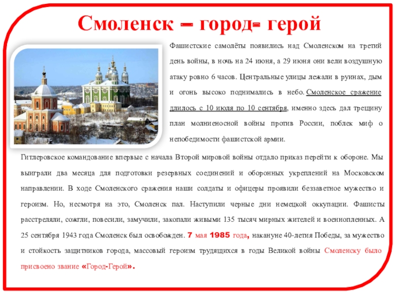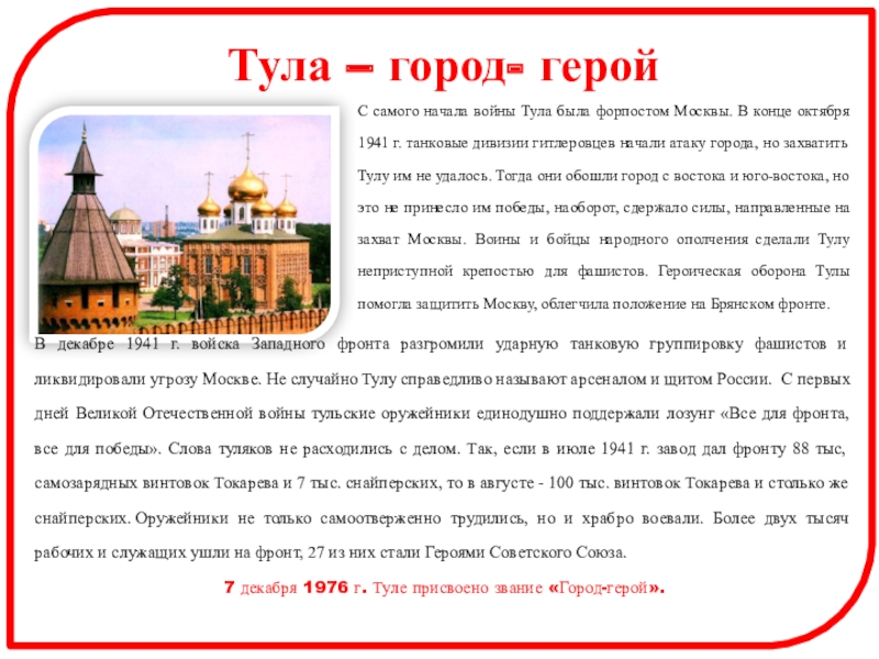 Руководил защитой Москвы командующий Западный фронтом, генерал армии Г.K. Жуков, впоследствии маршал, выдающийся полководец, герой Великой Отечественной войны. Гитлеровское командование поставило задачу: овладеть Москвой к 16 октября 1941 года. Но фашисты не смогли прорваться к Москве. Гигантское оборонительное сражение на подступах к столице выиграли наша армия и наш народ. И не просто выиграли. 5-6 декабря 1941 г. началось контрнаступление наших войск. Bраг был отброшен от столицы. В наступлении участвовали 75 вражеских дивизий, почти половина всех вооруженных сил противника. Разгром немцев под Москвой имел огромное значение.