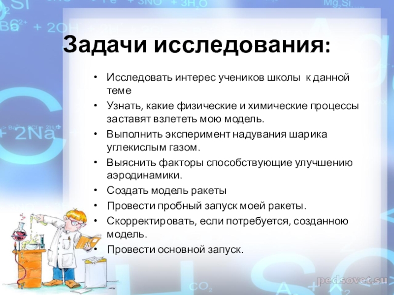 Задачи исследования:Исследовать интерес учеников школы к данной темеУзнать, какие физические и химические процессы заставят взлететь мою модель.Выполнить