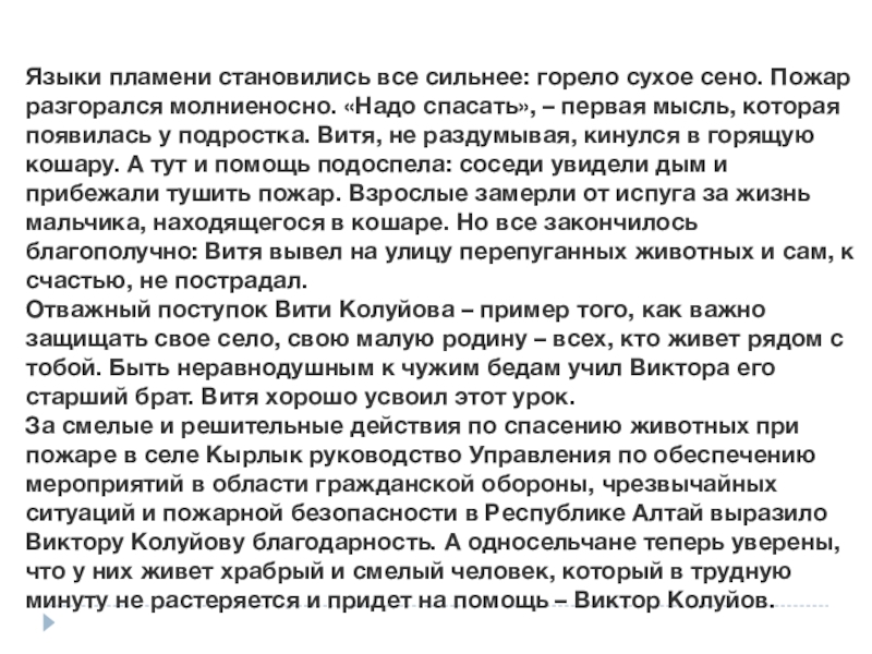 За смелые и решительные действия по спасению животных при пожаре в селе Кырлык руководство Управления по обеспечению мероприятий в области гражданской обороны, чрезвычайных ситуаций и пожарной безопасности в Республике Алтай выразило Виктору Колуйову благодарность. А односельчане теперь уверены, что у них живет храбрый и смелый человек, который в трудную минуту не растеряется и придет на помощь – Виктор Колуйов.