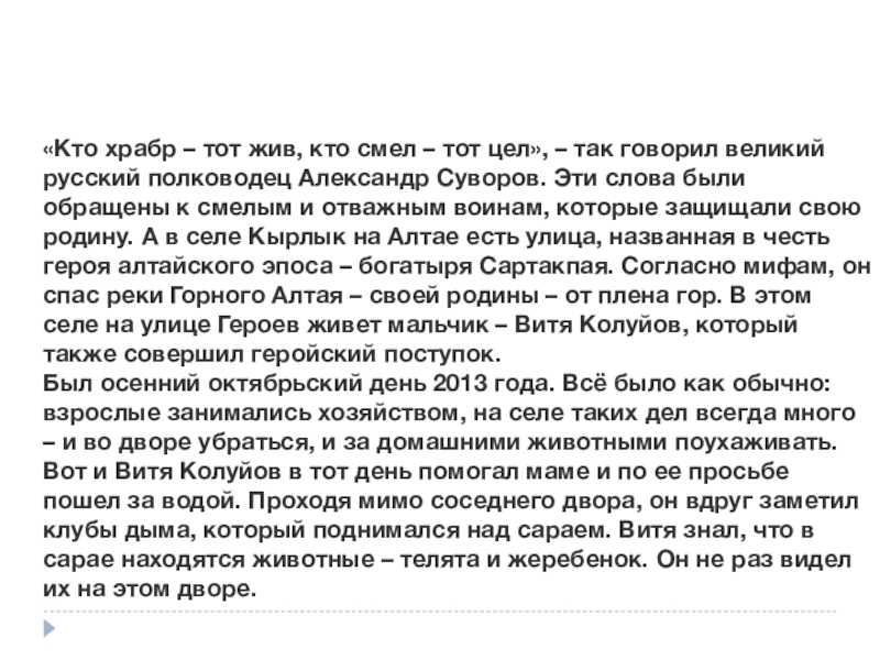 так говорил великий русский полководец Александр Суворов. Эти слова были обращены к смелым и отважным воинам, которые защищали свою родину. А в селе Кырлык на Алтае есть улица, названная в честь героя алтайского эпоса – богатыря Сартакпая. Согласно мифам, он спас реки Горного Алтая – своей родины – от плена гор. В этом селе на улице Героев живет мальчик – Витя Колуйов, который также совершил геройский поступок.