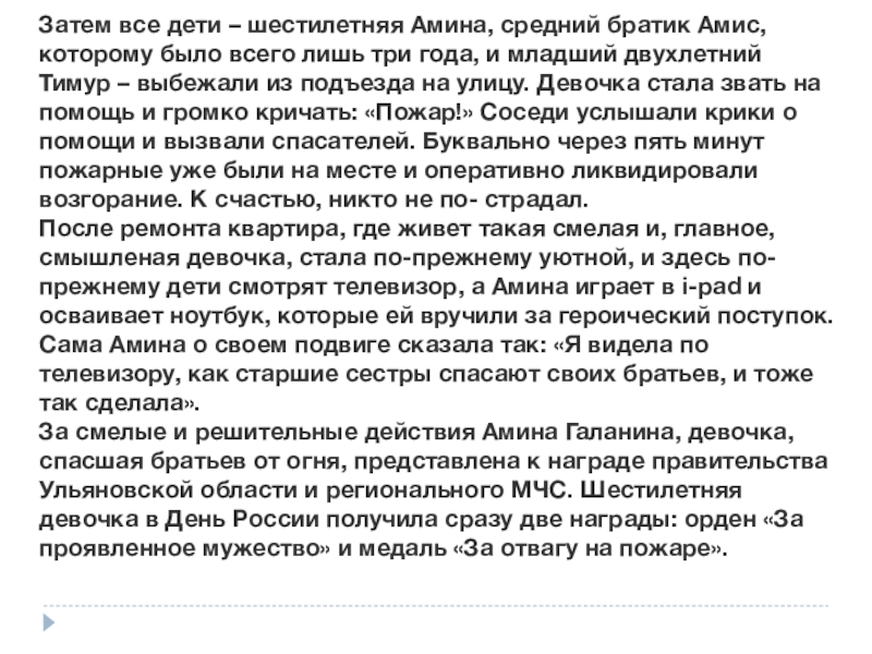 За смелые и решительные действия Амина Галанина, девочка, спасшая братьев от огня, представлена к награде правительства Ульяновской области и регионального МЧС. Шестилетняя девочка в День России получила сразу две награды: орден «За проявленное мужество» и медаль «За отвагу на пожаре».