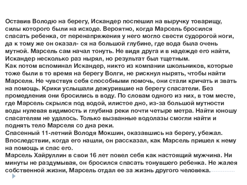 Оставив Володю на берегу, Искандер поспешил на выручку товарищу, силы которого были на исходе. Вероятно, когда Марсель бросился спасать ребенка, от перенапряжения у него могло свести судорогой ноги, да к тому же он оказал- ся на большой глубине, где вода была очень мутной. Марсель сам начал тонуть. Не видя друга и в надежде его найти, Искандер несколько раз нырял, но результат был тщетным.