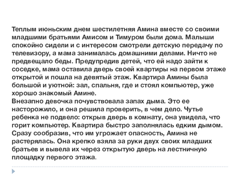 Внезапно девочка почувствовала запах дыма. Это ее насторожило, и она решила проверить, в чем дело. Чутье ребенка не подвело: открыв дверь в комнату, она увидела, что горит компьютер. Квартира быстро заполнялась едким дымом. Сразу сообразив, что им угрожает опасность, Амина не растерялась. Она крепко взяла за руки двух своих младших братьев и вывела их через открытую дверь на лестничную площадку первого этажа.