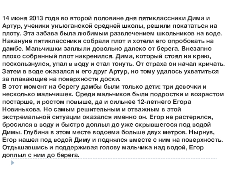 Артур, ученики унъюганской средней школы, решили покататься на плоту. Эта забава была любимым развлечением школьников на воде. Накануне пятиклассники собрали плот и хотели его опробовать на дамбе. Мальчишки заплыли довольно далеко от берега. Внезапно плохо собранный плот накренился. Дима, который стоял на краю, поскользнулся, упал в воду и стал тонуть. От страха он начал кричать. Затем в воде оказался и его друг Артур, но тому удалось ухватиться за плавающие на поверхности доски.