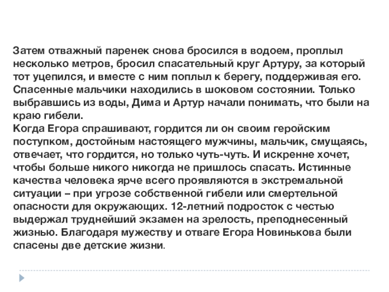 Когда Егора спрашивают, гордится ли он своим геройским поступком, достойным настоящего мужчины, мальчик, смущаясь, отвечает, что гордится, но только чуть-чуть. И искренне хочет, чтобы больше никого никогда не пришлось спасать. Истинные качества человека ярче всего проявляются в экстремальной ситуации – при угрозе собственной гибели или смертельной опасности для окружающих. 12-летний подросток с честью выдержал труднейший экзамен на зрелость, преподнесенный жизнью. Благодаря мужеству и отваге Егора Новинькова были спасены две детские жизни.