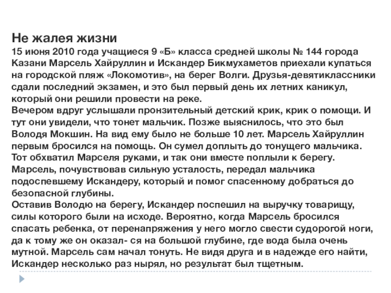 Марсель Хайруллин в свои 16 лет повел себя как настоящий мужчина. Ни минуты не раздумывая, он бросился спасать тонувшего ребенка. Не жалея собственной жизни, Марсель отдал ее за жизнь другого человека.
