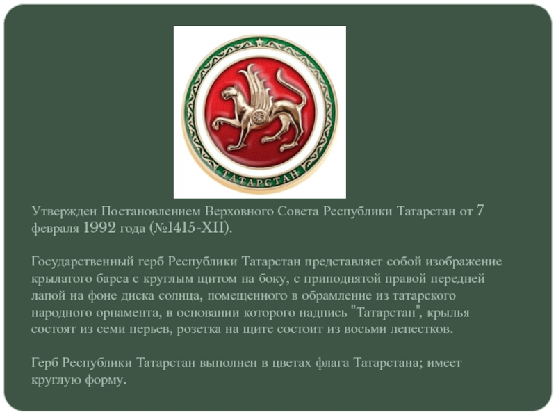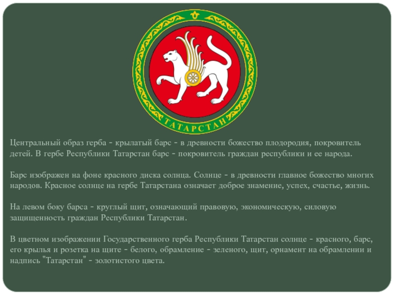 Государственный герб Республики Татарстан представляет собой изображение крылатого барса с круглым щитом на боку, с приподнятой правой передней лапой на фоне диска солнца, помещенного в обрамление из татарского народного орнамента, в основании которого надпись "Татарстан", крылья состоят из семи перьев, розетка на щите состоит из восьми лепестков.