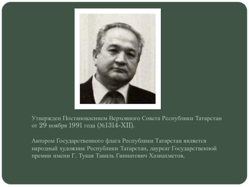 Слайд 3Утвержден Постановлением Верховного Совета Республики Татарстан от 29 ноября 1991 года
