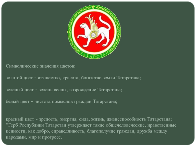 *Герб Республики Татарстан утверждает такие общечеловеческие, нравственные ценности, как добро, справедливость, благополучие граждан, дружба между народами, мир и прогресс.