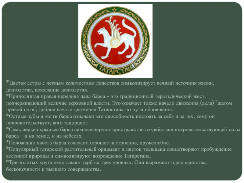 *Приподнятая правая передняя лапа барса - это традиционный геральдический жест, подчеркивающий величие верховной власти. Это означает также начало движения (дела) "шагом правой ноги", доброе начало движения Татарстана по пути обновления.