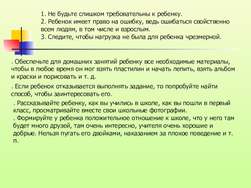 . Формируйте у ребенка положительное отношение к школе, что у него там будет много друзей, там очень интересно, учителя очень хорошие и добрые. Нельзя пугать его двойками, наказанием за плохое поведение и т. п.