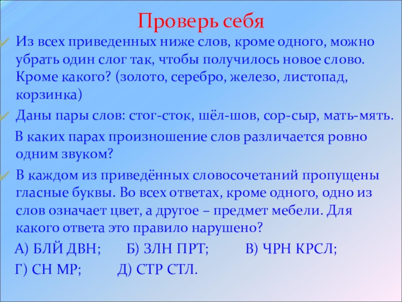 Слова различаются количеством звуков, набором звуков, последовательностью расположения.