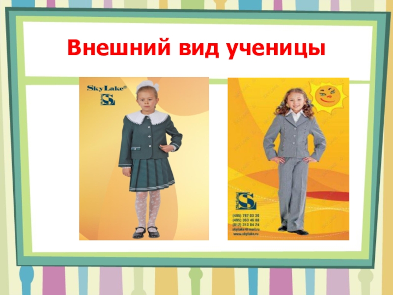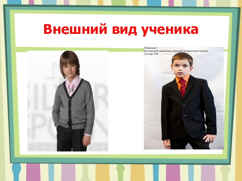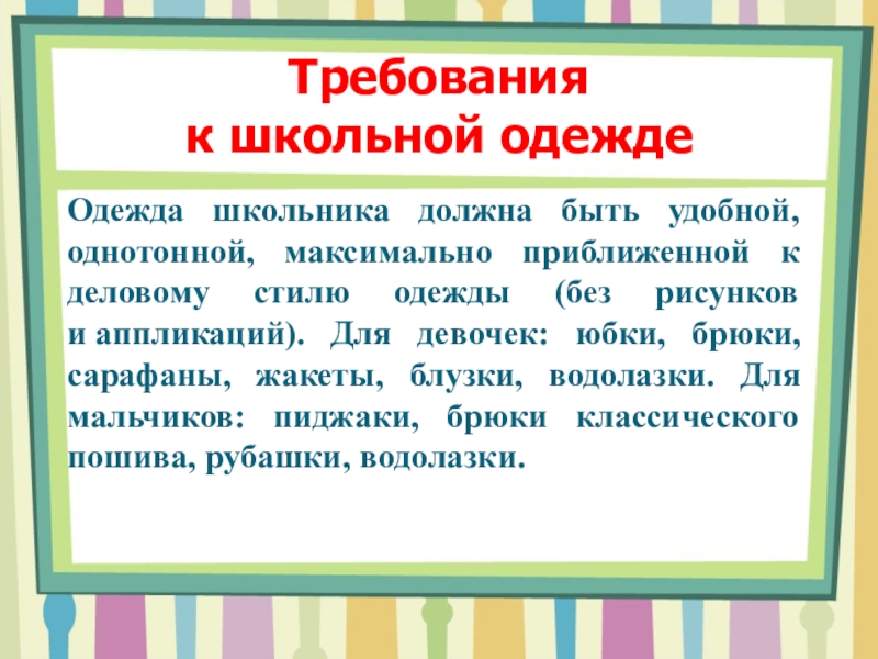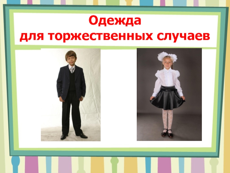 к деловому стилю одежды (без рисунков и аппликаций). Для девочек: юбки, брюки, сарафаны, жакеты, блузки, водолазки. Для мальчиков: пиджаки, брюки классического пошива, рубашки, водолазки.