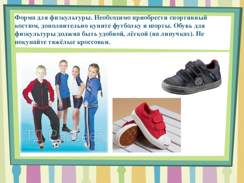 Слайд 36Форма для физкультуры. Необходимо приобрести спортивный костюм, дополнительно купите футболку и