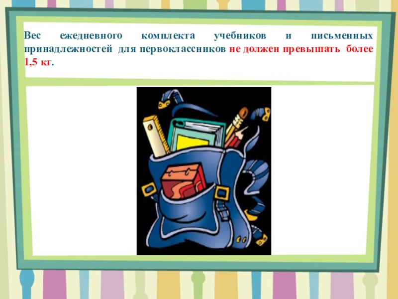 Слайд 8Вес ежедневного комплекта учебников и письменных принадлежностей для первоклассников не должен