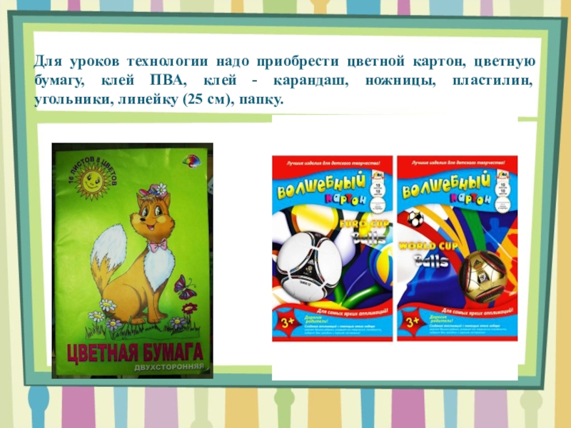 Слайд 30Для уроков технологии надо приобрести цветной картон, цветную бумагу, клей ПВА,