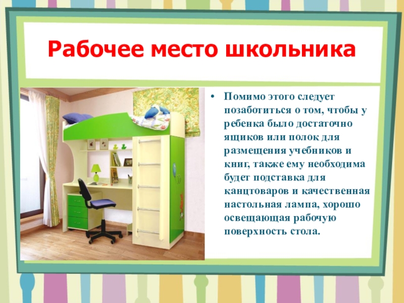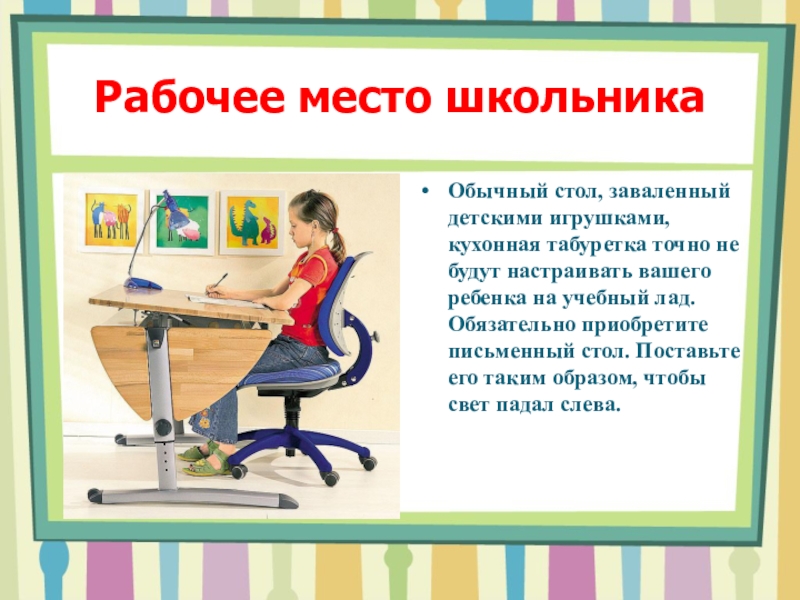 будут настраивать вашего ребенка на учебный лад. Обязательно приобретите письменный стол. Поставьте его таким образом, чтобы свет падал слева.