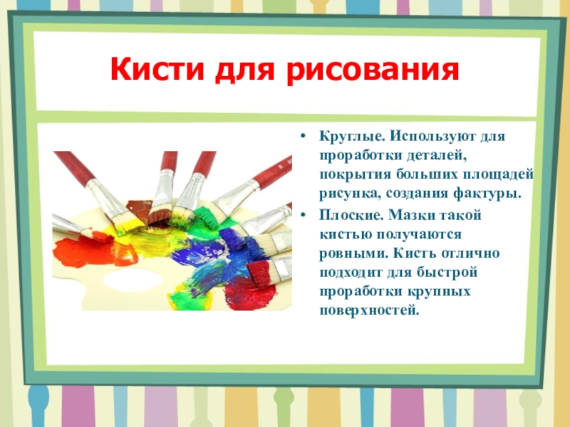 Плоские. Мазки такой кистью получаются ровными. Кисть отлично подходит для быстрой проработки крупных поверхностей.
