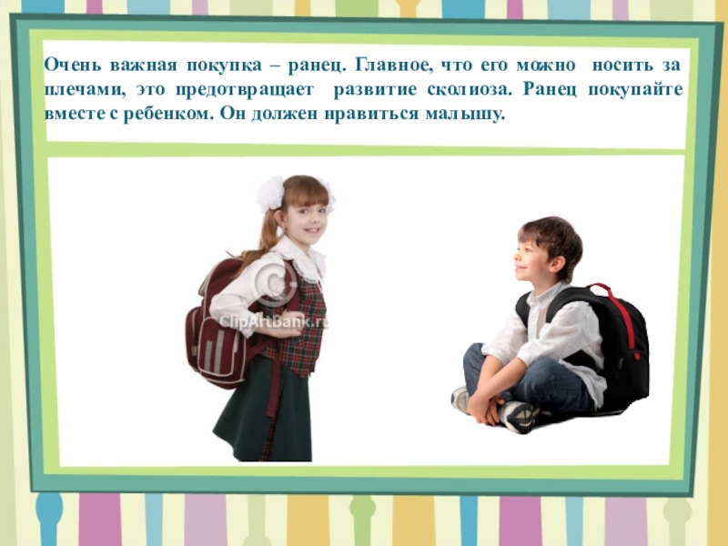 плечами, это предотвращает развитие сколиоза. Ранец покупайте вместе с ребенком. Он должен нравиться малышу.