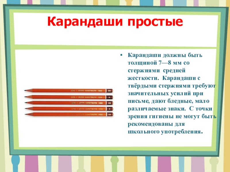 жесткости. Карандаши с твёрдыми стержнями требуют значительных усилий при письме, дают бледные, мало различаемые знаки. С точки зрения гигиены не могут быть рекомендованы для школьного употребления.