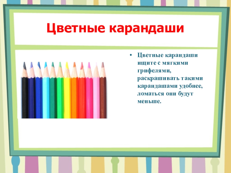 Цветные карандаши ищите с мягкими грифелями, раскрашивать такими карандашами удобнее,