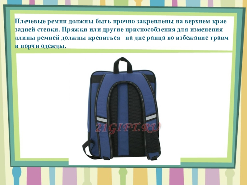 Слайд 6Плечевые ремни должны быть прочно закреплены на верхнем крае задней стенки.