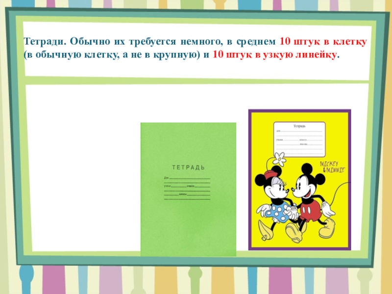 Слайд 9Тетради. Обычно их требуется немного, в среднем 10 штук в клетку