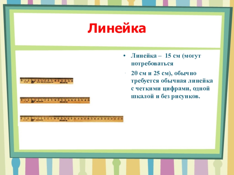 обычно требуется обычная линейка с четкими цифрами, одной шкалой и без рисунков.