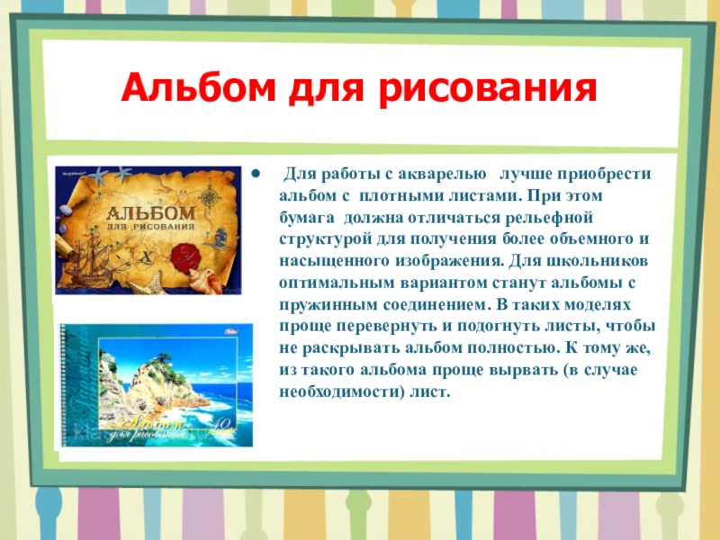 плотными листами. При этом бумага должна отличаться рельефной структурой для получения более объемного и насыщенного изображения. Для школьников оптимальным вариантом станут альбомы с пружинным соединением. В таких моделях проще перевернуть и подогнуть листы, чтобы не раскрывать альбом полностью. К тому же, из такого альбома проще вырвать (в случае необходимости) лист.