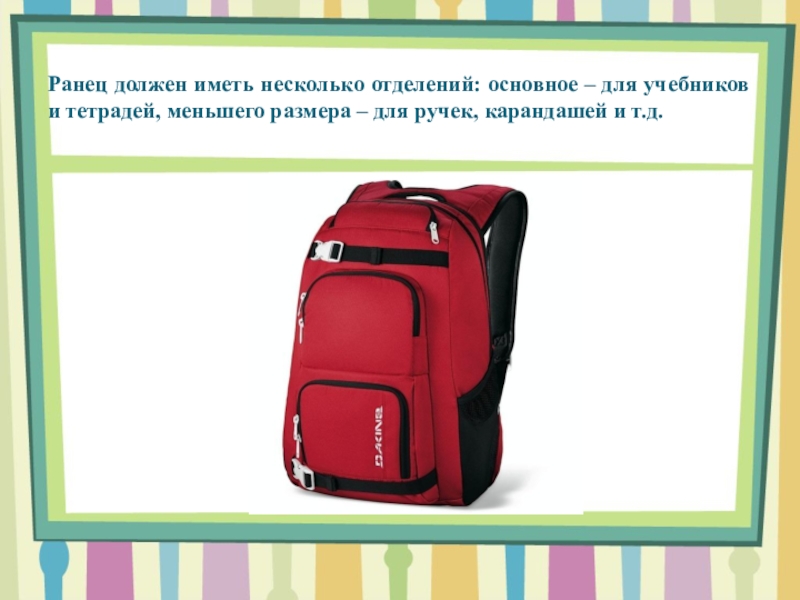 Слайд 7Ранец должен иметь несколько отделений: основное – для учебников и тетрадей,