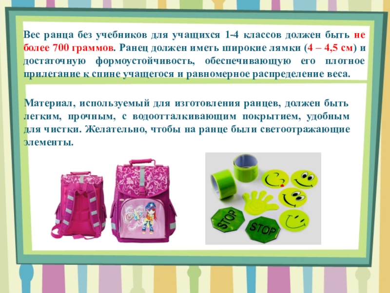 более 700 граммов. Ранец должен иметь широкие лямки (4 – 4,5 см) и достаточную формоустойчивость, обеспечивающую его плотное прилегание к спине учащегося и равномерное распределение веса.