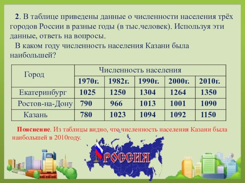 Пояснение. Из таблицы видно, что численность населения Казани была наибольшей в 2010году.